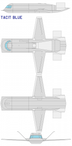 The TACIT BLUE prototype was nicknamed “The Whale” or “Shamu” by the people who worked on it; the real name of the plane, if any, has never been revealed. TACIT BLUE featured a straight, tapered wing with a “V” tail mounted on an oversized fuselage with a curved shape. It had a wingspan of 48.2 feet and a length of 55.8 feet and weighed 30,000 pounds. A single flush inlet on the top of the fuselage provided air to two high-bypass turbofan engines. Flight control was supplied by a quadruply-redundant, digital fly-by-wire flight system that stabilized the aircraft about the longitudinal and directional axes.